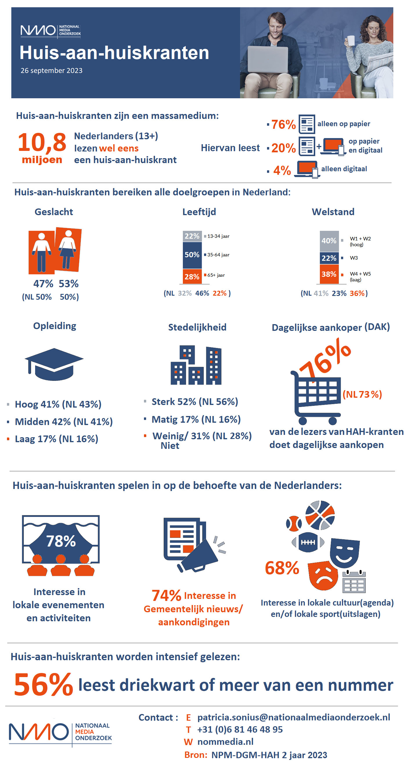 Nationaal Media Onderzoek heeft op 26 september de bereikcijfers van de huis-aan-huiskranten van 2023 bekendgemaakt. Uit dit onderzoek blijkt dat 10,8 miljoen Nederlanders wel eens een huis-aan-huiskrant leest, waarvan 76% via de papieren versie. Bijna de helft (46%) van de Nederlanders leest iedere week de huis-aan-huiskrant.
