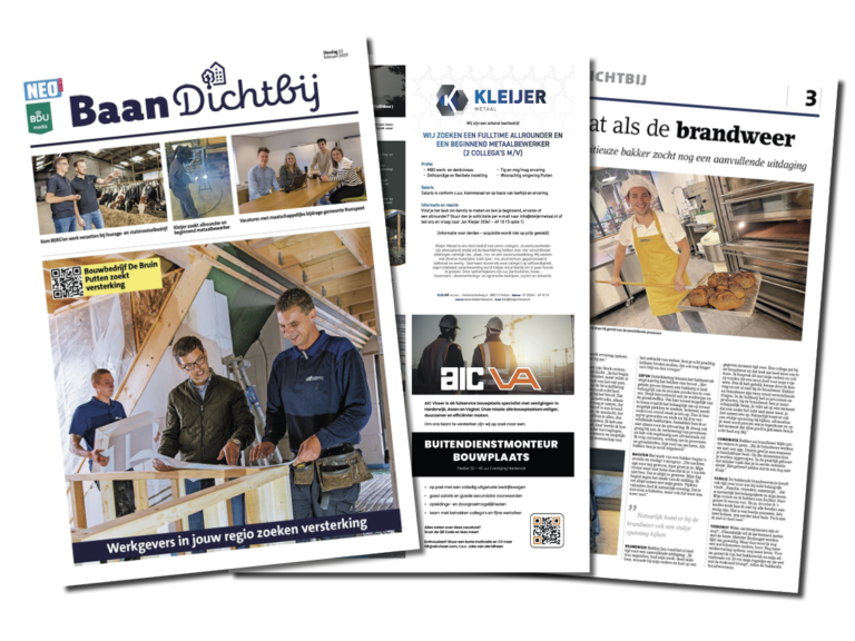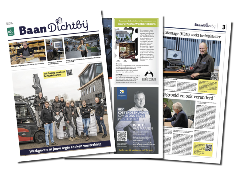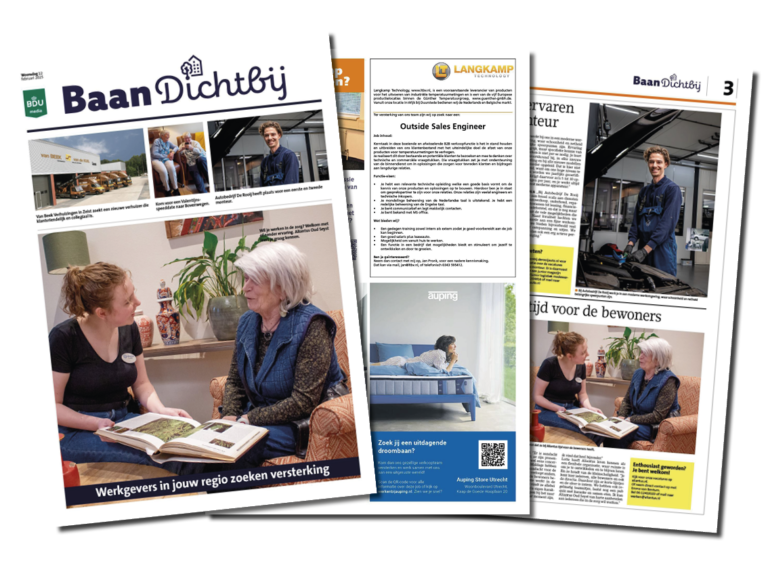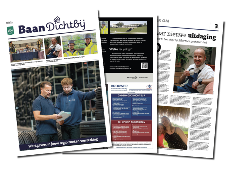 De BaanDichtbij vacaturekrant staat vol met (lokale) vacatures, redactionele verhalen over carrièreswitches, ontwikkelingen op de arbeidsmarkt, werk & privé en nog veel meer! De vacaturekrant van BaanDichtbij is daarom een ideaal middel om ook jouw vacatures bekend te maken, dit jaar verschijnen deze specials in de week van 9 februari, 11 mei, 14 september en 23 november.